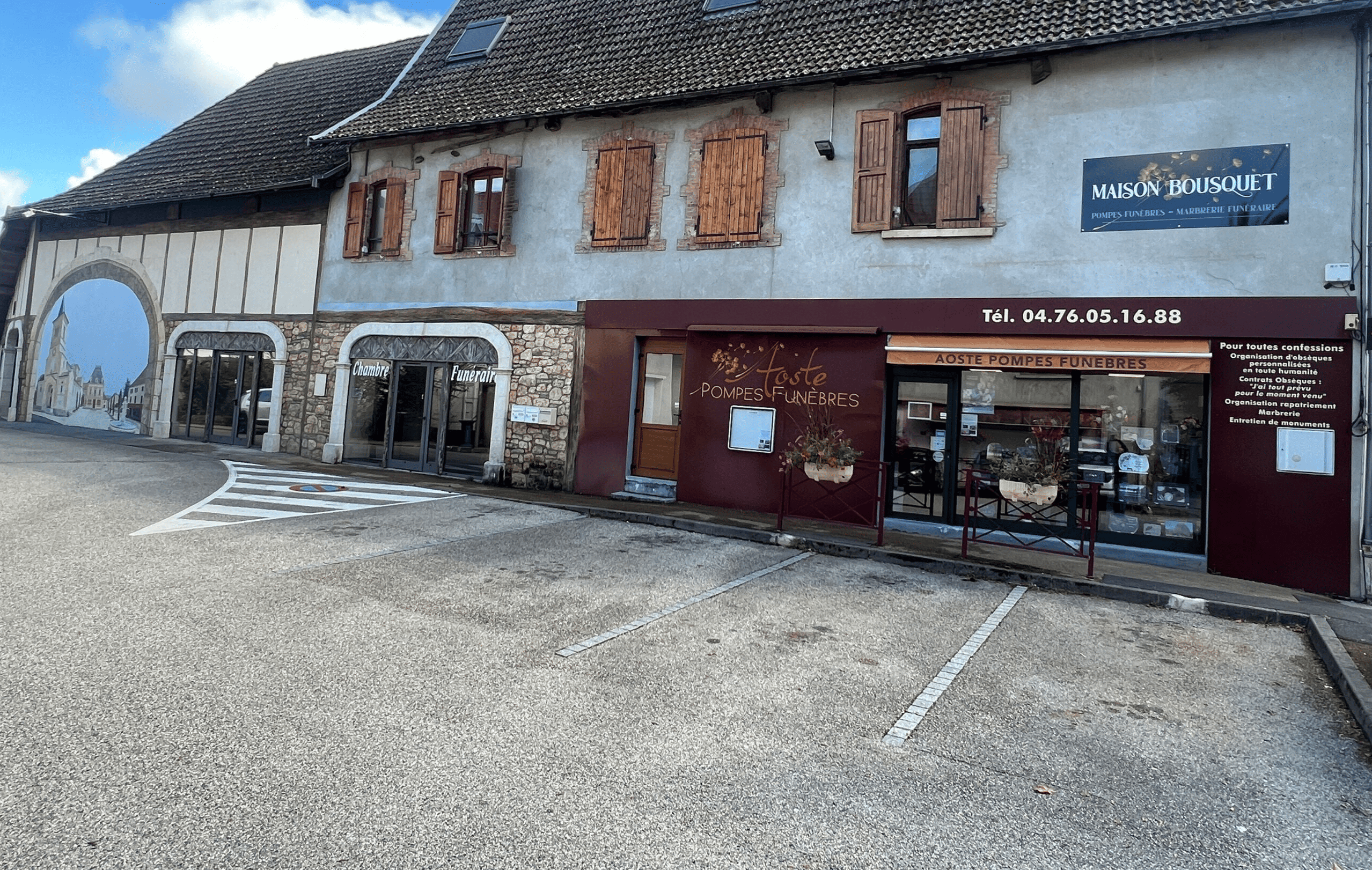 Maison Bousquet, nous accueillons les familles en deuil dans notre agence située 4 place du Musée, à Aoste (38490). Nichée entre l'Isle Crémieu et les premiers contreforts du Jura, cette commune d'Isère aux riches vestiges gallo-romains est le cœur de notre territoire d'intervention, aux côtés des familles d'Aoste et des communes environnantes (Morestel, Crémieu, La Bâtie-Montgascon).